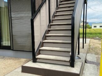 塗り替え工事と合わせて隣の倉庫棟も塗り替えを行い、そして屋外階段の床シート張りも行いました!