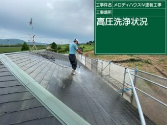 お客様からのご紹介で塗装塗り替え工事を行います。現場調査時に幕板基材の剥がれ、外壁塗装部分からのチョーキングが見られました。屋根塗装部分については、北面のコケが見られ西面は西日の影響で色褪せがありました。