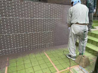 ブロック塀はデザイン塗装にて明るいカラーにて吹き付けを行いました!現場調査時に外壁の色褪せ、玄関吹付部分の塗膜剥離、屋根部分は北面はコケ・藻の発生、全体的な紫外線による色褪せが見られました。適正に処置を行い塗り替え工事を行います!