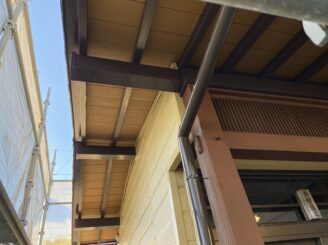 現場調査時に外壁部分の一部塗膜剥離・チョーキング、小庇部のボードずれ・木部枠の劣化、シーリング劣化が見られました。小庇のボードは交換を行い、木部枠の劣化についてはガルバリウム鋼板にて被せていきます。よろしくお願いします!