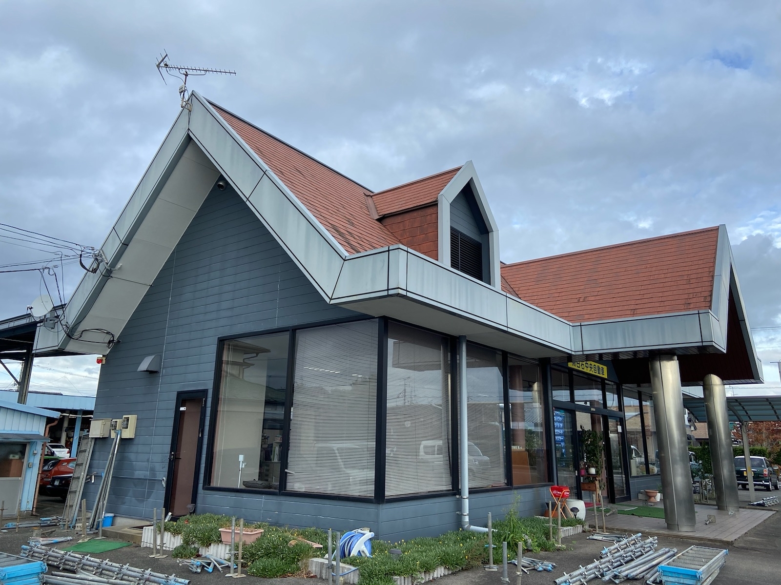 事務所の塗り替え工事を行いました。屋根・外壁とも遮熱性能の塗料を使いました!15年前に弊社で塗り替えを行い、今回2回目の塗替え工事を行います。現場調査時に外壁・屋根全体の色褪せ、チョーキングがありました。