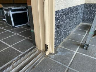 ドアリモフレームを取付して、隙間はモルタルを充填していきます