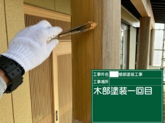 現場調査時には付帯部木部の塗膜剥離、外壁チョーキングが発生している状態でした。