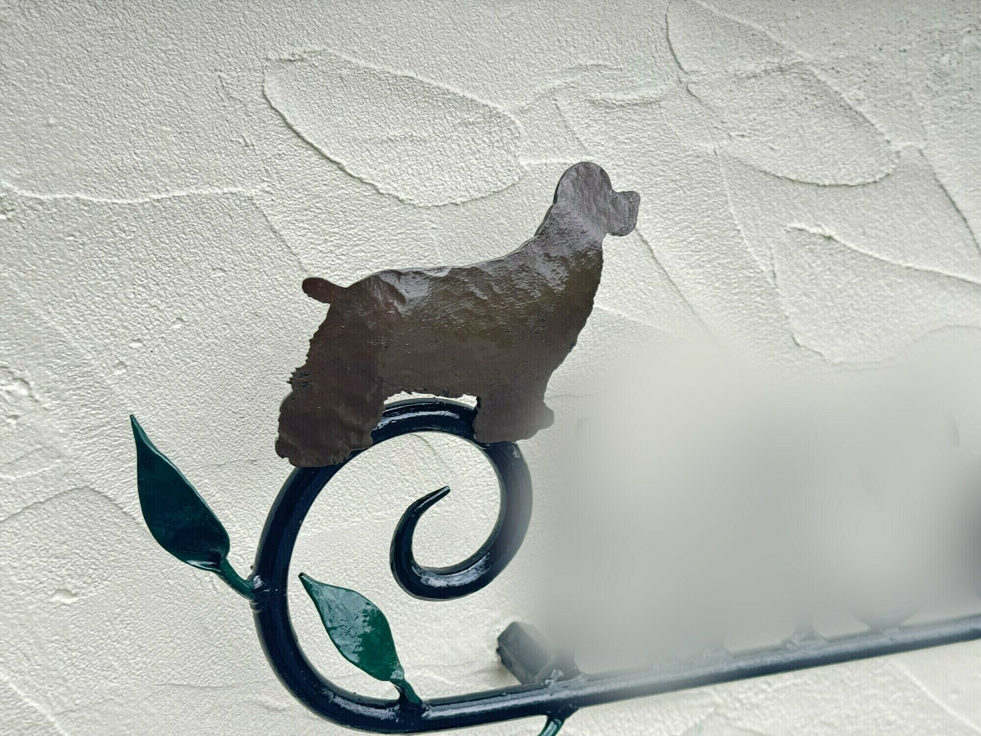 そこで、枝葉は落ち着きのある深緑、犬は施主様の愛犬の色味に合わせ、コーヒーブラウン系で塗装いたしました。