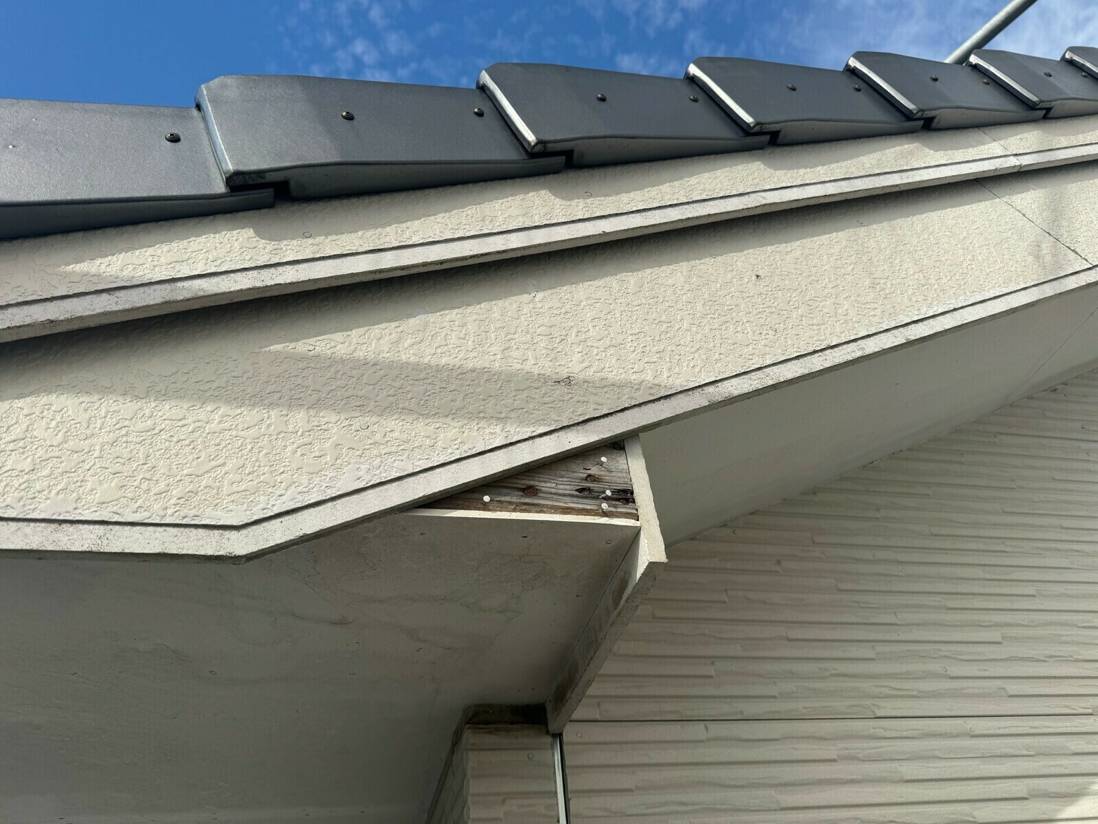 破風の一部は腐食して外れ、下地材の木がむき出しになっていました。