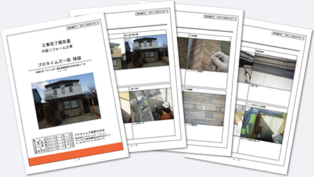 使用した塗料、塗布量、実施した施工内容、工事完了検査の結果を、各写真と工事の内容、施工箇所などを記載した『工事完了報告書』にしてお客様へご提出します。